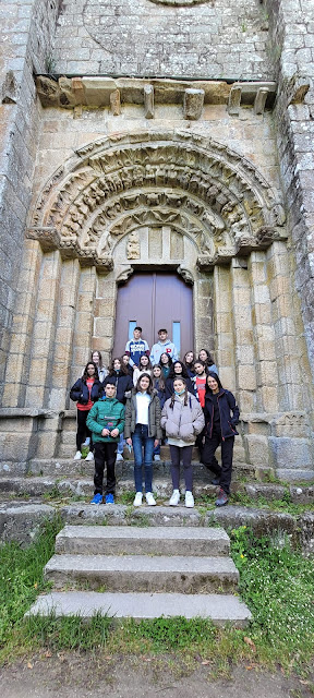 A primeira parada foi o MOSTEIRO DE CARBOEIRO. Alí, da man de Xesús e Núria, integrantes de Tesouros novos, coñeceron como se foi construíndo o edificio, o paso do románico serodio ao gótico cos diferentes tipos de arcos e bóvedas; viron os restos da policromía que cubría as paredes interiores; estudaron as ábsidas e rosetóns; convertéronse no Abade Fernando por un momento, co seu báculo e mitra; descubriron os gravados (os auténticos e as mostras de vandalismo) e coñeceron a historia deste singular edificio desde as súas orixes no século X, símbolo do poder nobiliario relixioso, ata a reconstrución actual, pasando pola desamortización, o período de abandono total, o espolio e o vandalismo. Xa fóra do edificio, na aula de interpretación, xogaron a ser mestres de obra e canteiros e levantaron, peza a peza, unha maqueta do edificio. Mais, antes tiveron que aprender a facer arcos de medio punto e apuntalados, e conseguir que ao quitar o acimbre de madeira a clave aguantase ben e o arco non se derrubase.
